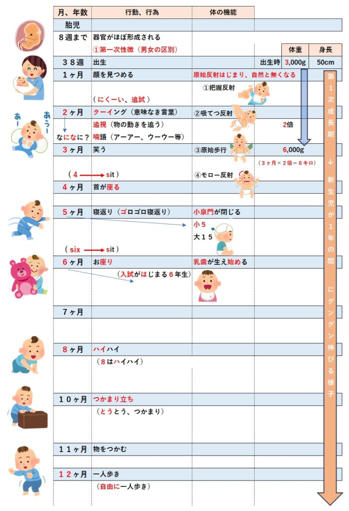乳幼児の成長と発達まとめ。視覚的に覚えれる様に2枚のPDFにおさめました。