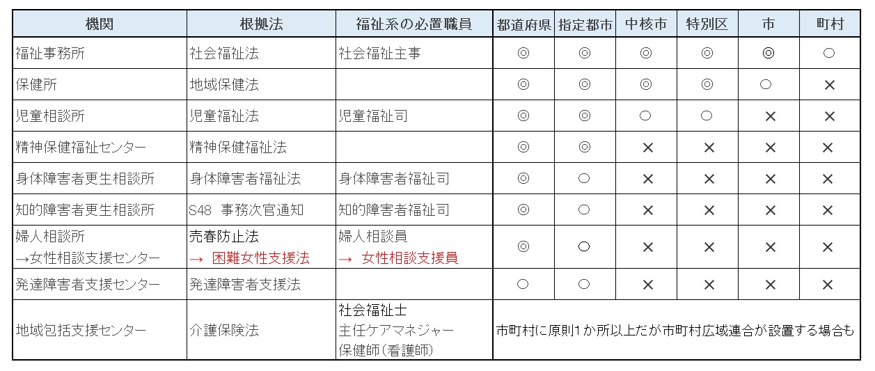 市町村福祉事務所は福祉6法(上記3法に加え老人、身体、知的)を管轄。